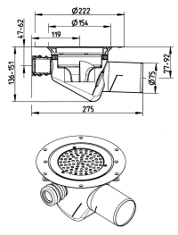 BLÜCHER Domestic-150 justerbar afløb for vinylgulve, med sideindløb og vandret Ø75mm udløb, samt indbygget vandlås. Lav model.