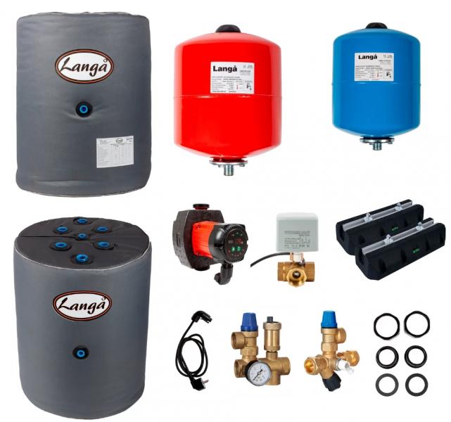 Pakke med alt tilbehør der skal bruges til en komplet installation med brugsvand. Der er valgt mindre tanke for at spare på pladsen. Kan dække op til 120 m² hus og varmt brugsvand til maks. 1-2 personer. Denne pakke er tiltænkt mindre boliger hvor der ikke er plads til en større akkumuleringstank. Bemærk at en mindre tank giver mindre varmt brugsvand, så der vil typisk kun være nok varmt vand til 1 bad, maks 2. Herefter skal tanken varmes op igen. To temperatursæt, kan indstilles i varmepumpen. Denne pakke indeholder: