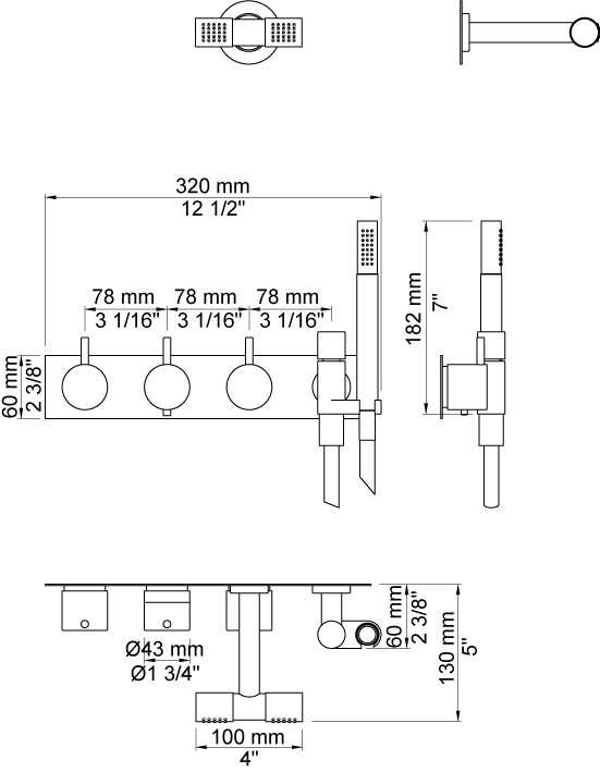 Vola Indbygningstermostat ¾'' med omskifter T2 håndbruser med metalslange og holder til højre Dobbelt hovedbruser, 115 mm Separat udløb Dækplade Krom 16 3/4''RG/PEX
